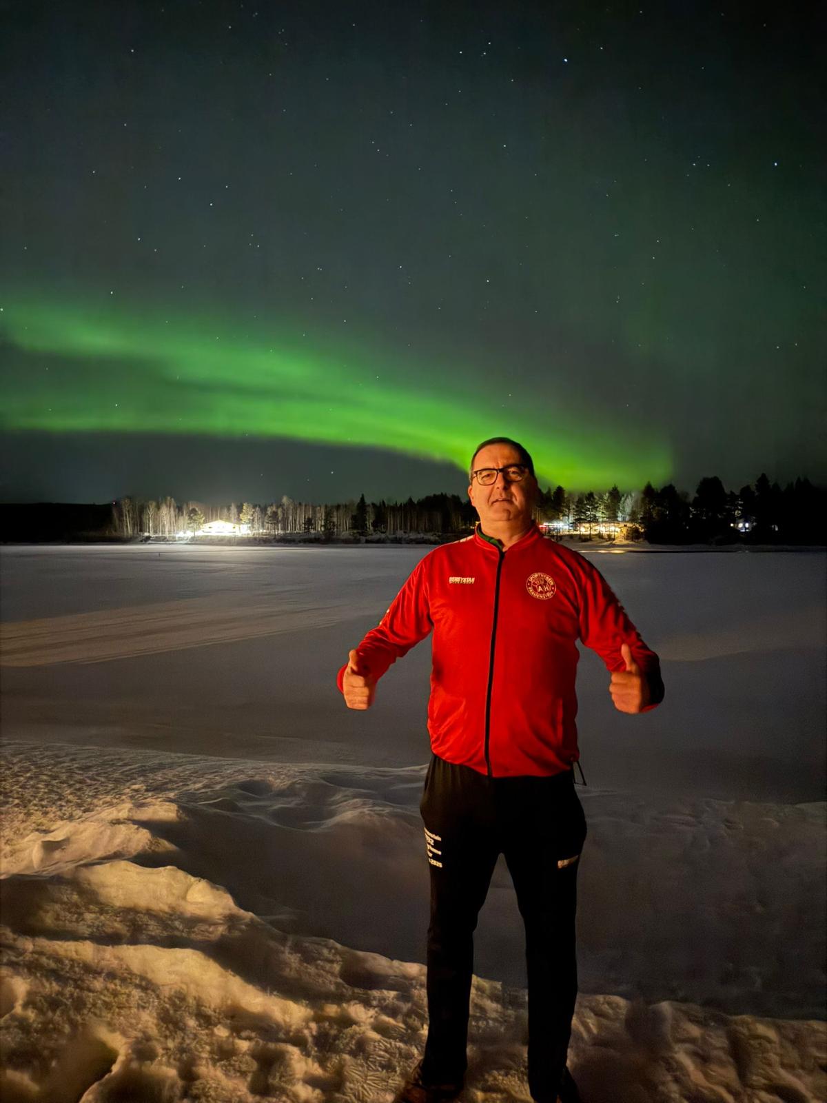 Unser Balkanmaradona Alexandru Radu verbrachte seinen Winterurlaub im Weihnachtsmanndorf in Lappland und sendete weihnachtliche Grüße aus Rovaniemi an die Bodenwaage. Schneeweißer Hintergrund mit Polarlichtern - was will man mehr?