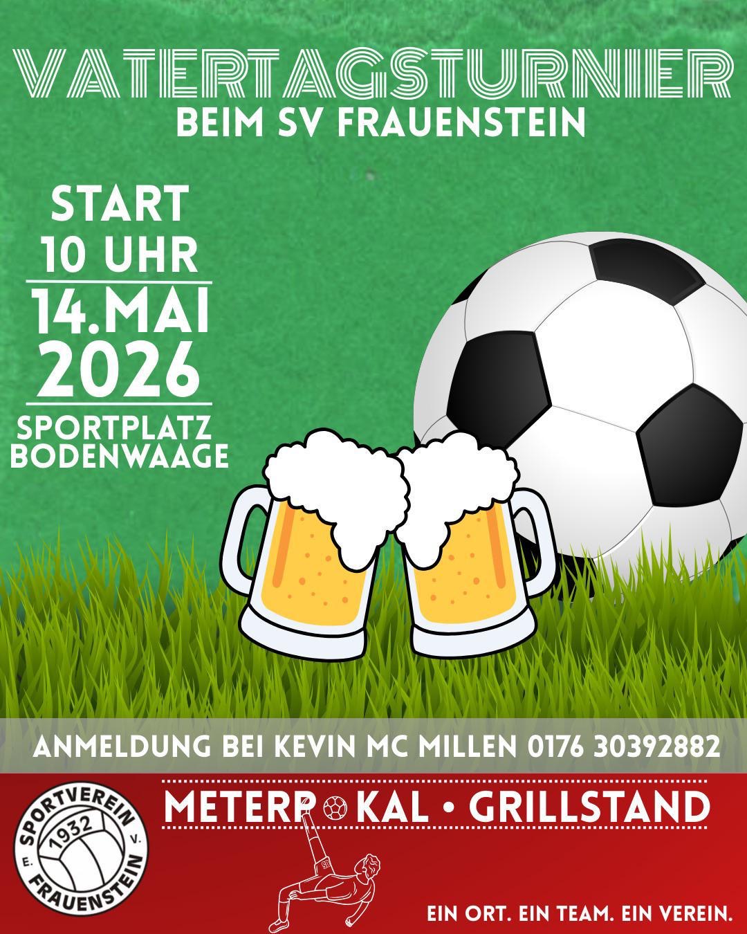Am 14.05.2025 findet hoffentlich bei bestem Wetter unser alljährliches Vatertagsturnier statt. Wie immer wird um den heiß begehrten Meterpokal gekämpft und natürlich vor allem Fußball gespielt. Los geht’s um 10 Uhr. Wir freuen uns auf bekannte Gesichter sowie neue Teilnehmer!