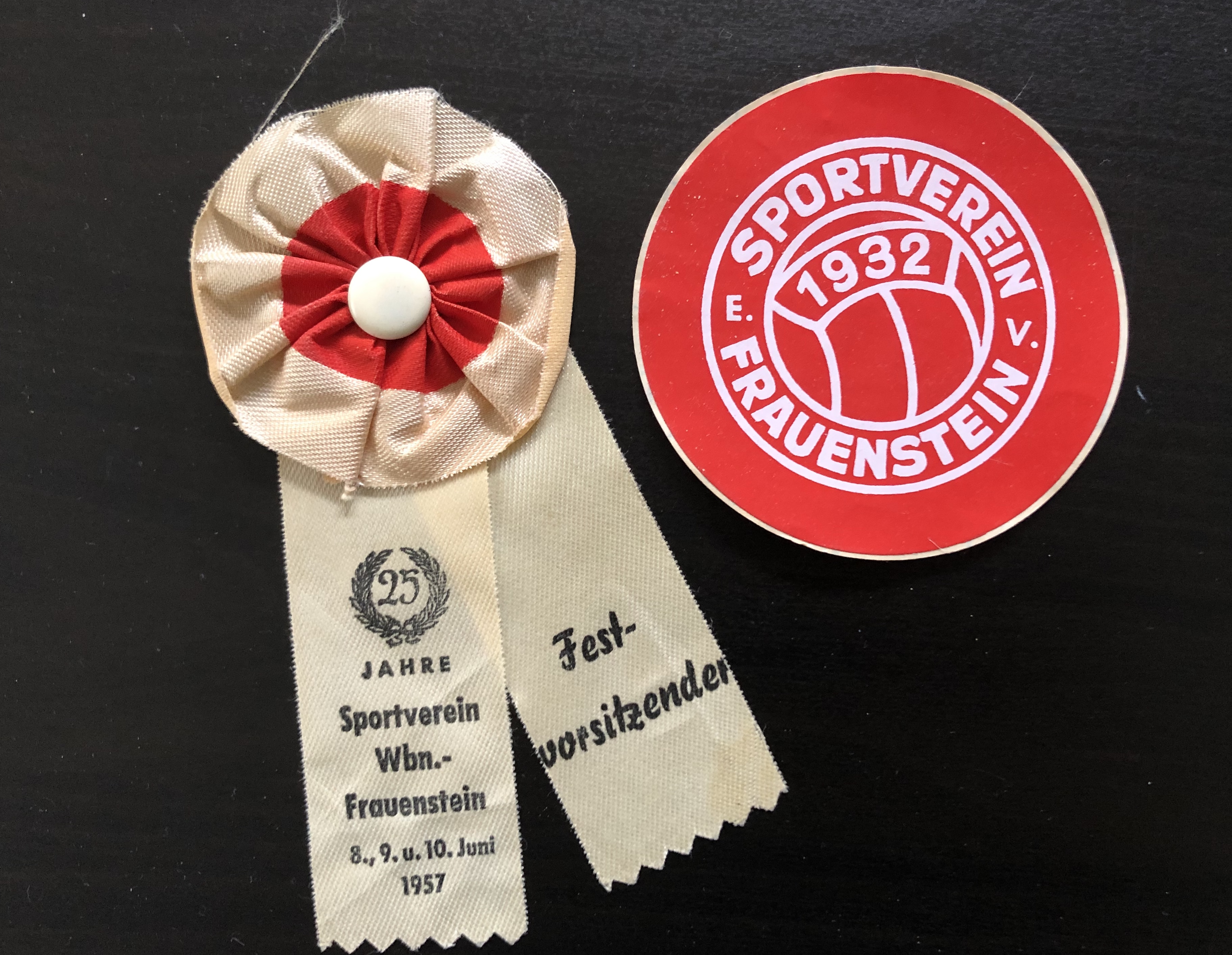 Bereits Anfang Mai erreichte uns der Anstecker auf dem folgenden Foto zum 25-jährigen Vereinsjubiläum des SV Frauenstein 1932 e.V. im Jahr 1957 von unserem Ehrenmitglied und langjährigen ehrenamtlichem Platzkassierer Jürgen Funk. Unsere 1. Mannschaft konnte die Saison damals mit dem 3. Tabellenplatz in der 2. Amateurliga Hessen abschließen, nachdem sie ein Jahr zuvor aus der A-Klasse Wiesbaden in die vierthöchste Spielklasse aufgestiegen war. Weitere historische Daten und Vereinsschriften findet ihr übrigens in den Kategorien "Festschriften", "Saisonhefte" und "Statistiken".