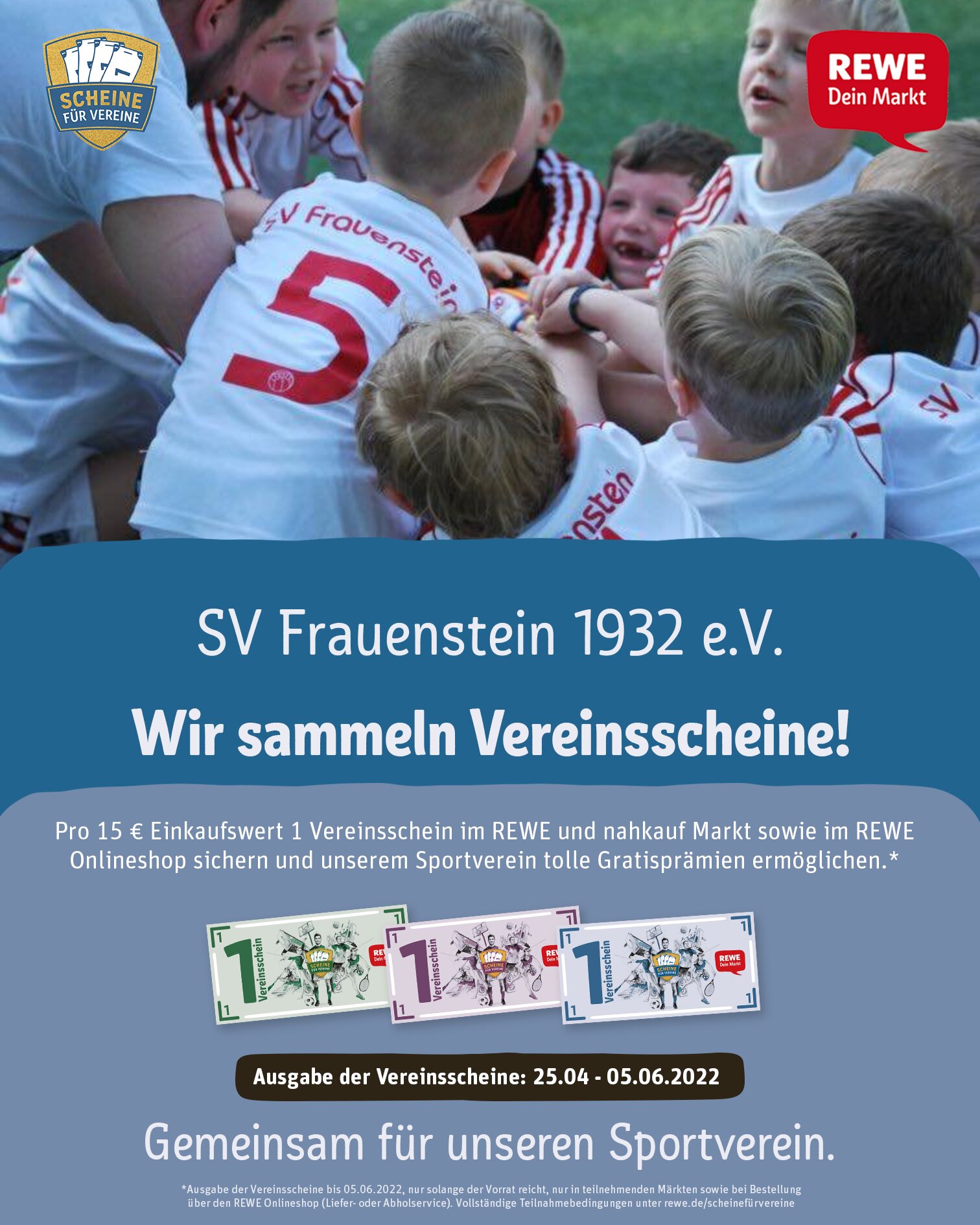 Wir freuen uns auch dieses Jahr wieder bei der Rewe-Aktion "Scheine für Vereine" dabei zu sein und zählen auf eure Unterstützung! Ab einem Einkaufswert von 15 € erhaltet ihr wieder jeweils einen Vereinsschein, den ihr zugunsten des SVF einscannen könnt. Alternativ stehen in den Rewe-Märkten in Dotzheim (Hans-Böckler-Straße 1 A, 65199 Wiesbaden) und Walluf (Am Klingenweg 2, 65396 Walluf) wieder Boxen bereit, in die ihr eure Vereinsscheine für unseren Verein einwerfen könnt! Zusätzlich können die Scheine auch im Vereinsheim bei unserer Lena abgegeben oder in einer dort platzierten Box eingeworfen werden. Macht mit und helft uns durch eure Teilnahme bis 05.06.2022 genügend Scheine für interessante Prämien zu sammeln, mit denen wir unser Vereinsheim weiter verschönern können!