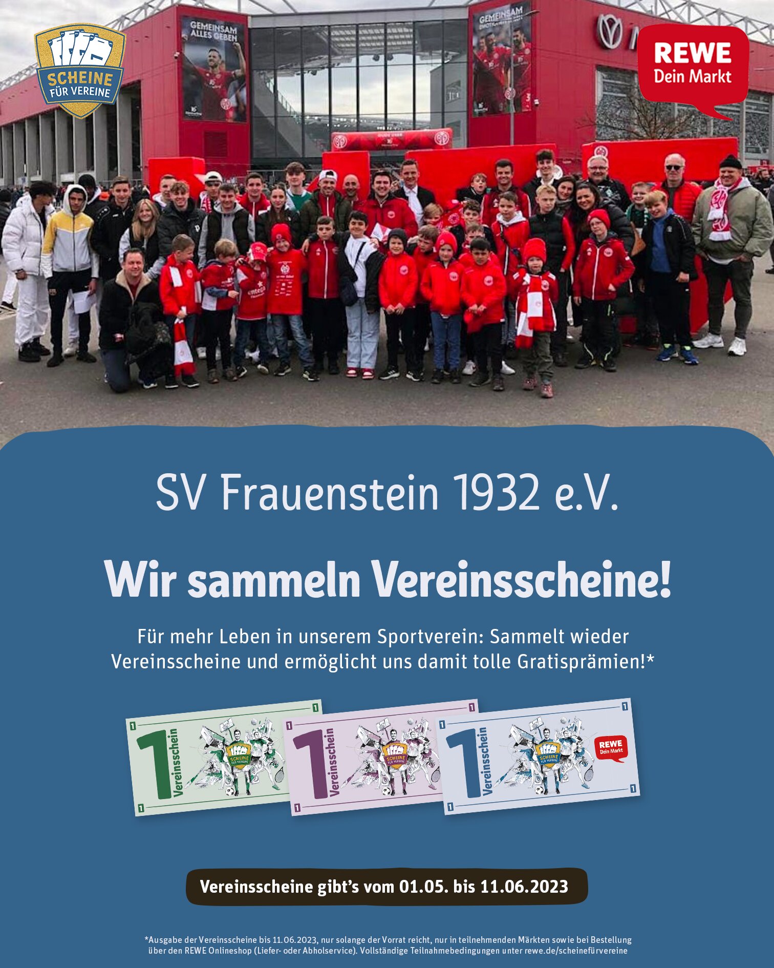Heute startet die Aktion "Scheine für Vereine" in die nächste Runde. Für 15 Euro Einkaufswert erhaltet ihr in allen Rewe-Märkten jeweils wieder einen Vereinsschein, den ihr dem SVF unter folgendem Link zuordnen könnt: Zuordnung der Vereinsscheine für den SV Frauenstein. Alternativ stehen in dem Rewe-Markt in Dotzheim (Hans-Böckler-Straße 1A, 65199 Wiesbaden) Boxen bereit, in die ihr eure Vereinsscheine einwerfen könnt, oder ihr könnt eure Vereinsscheine in unserem Vereinsheim abgeben. Gemeinsam können wir wieder einiges bewegen und genügend Scheine sammeln, um unserem Verein den Erwerb von interessanten Prämien zu ermöglichen!