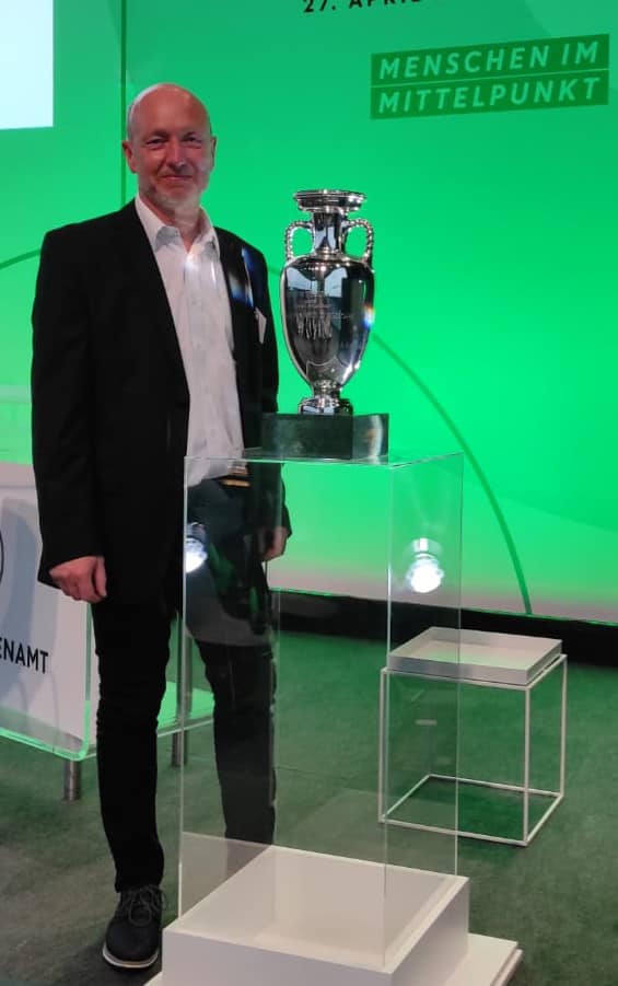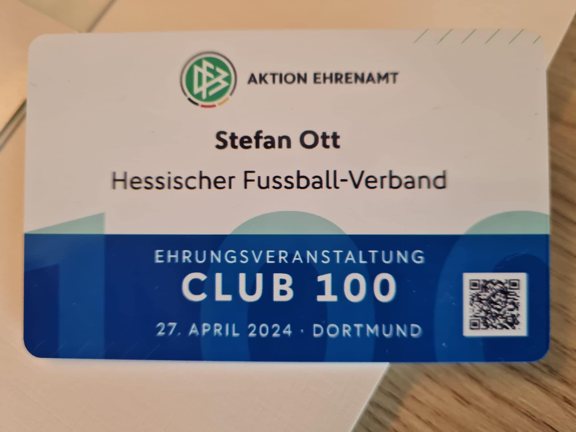 Am vergangenen Wochenende war unser Geschäftsführer Stefan Ott im Rahmen der Ehrungsveranstaltung zur Aufnahme in den Club 100 des DFB zu Gast im Deutschen Fußballmuseum in Dortmund. Stefan wurde aufgrund seines jahrzehntelangen ehrenamtlichen Engagements für unseren Verein in den Club 100 des DFB aufgenommen und als Gewinner des Hessischen Fußballverbands gemeinsam mit weiteren Vereinsvertretern anderer Landesverbände geehrt. Neben einem standesgemäßen Empfang inklusive Menü stand ein Besuch des Deutschen Fußballmuseums sowie die Würdigung der Vereinsverantwortlichen durch DFB-Präsident Bernd Neuendorf auf dem Programm, der dabei Unterstützung von den DFB-Legenden Horst Hrubesch und Rudi Völler erfuhr.