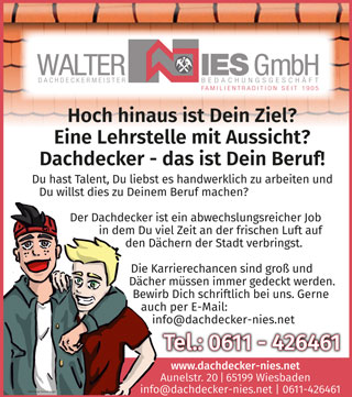 Das 1905 gegründete Familienunternehmen bildet aus und bietet für interessierte Jugendliche Lehrstellen an. Bei Interesse könnt ihr euch direkt an die unten angegeben Kontaktdaten wenden - Die Walter Nies GmbH freut sich über euren Anruf und unterstützt euch bei eurem Start ins Berufsleben!