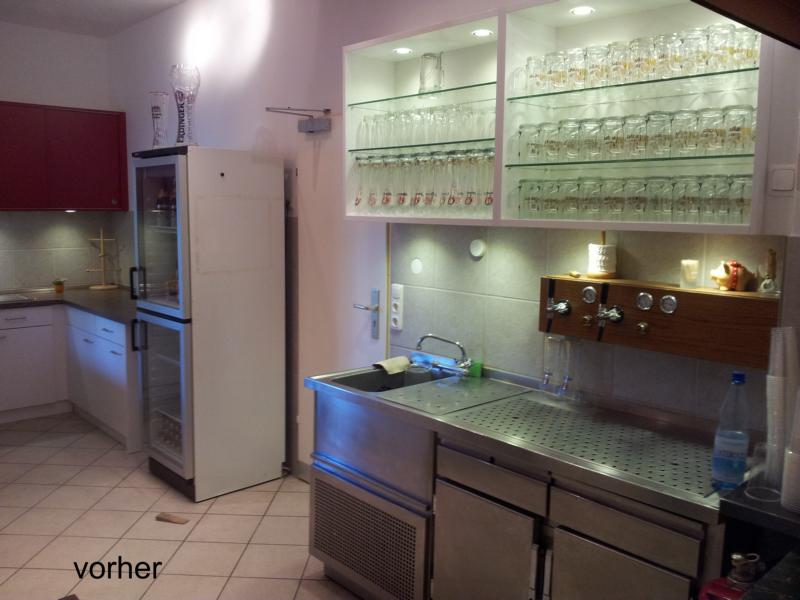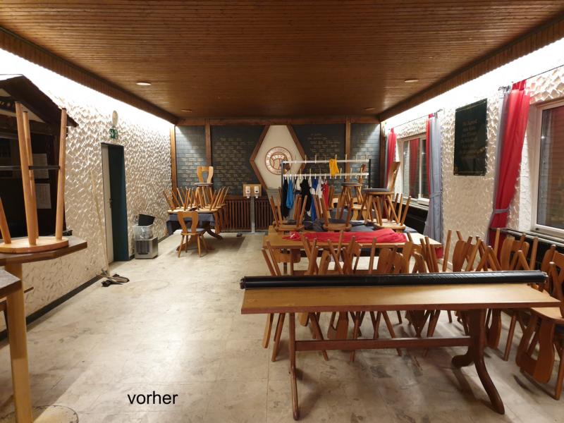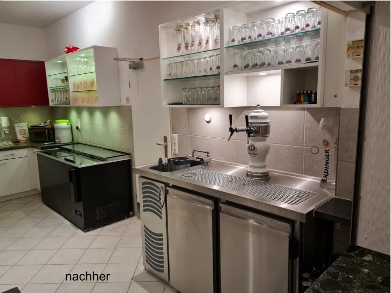 Der alte Fasskühler im Flur unseres Vereinsheims wurde abgebaut und entsorgt. In der Küche haben wir eine neue Zapftheke (unser Präsident Thomas Küpper nennt sie den „heiligen Gral“) mit Fasskühler eingebaut und angeschlossen. Die Regale über der Zapftheke wurden neu angefertigt und zusätzlich wurde eine neue Kühltruhe aufgestellt. Der Flur und auch der Gastraum wurden neu gestrichen und auch die Holzdecke im Gastraum erfreut sich eines hellen Anstrichs. Zusätzlich wurde von künstlerischer Hand ein Graffiti an der Wand unserer Tanzfläche angebracht. Abschließend wurde der Natursteinboden im Flur und im Gastraum von einer Fachfirma abgeschliffen und neu versiegelt.
