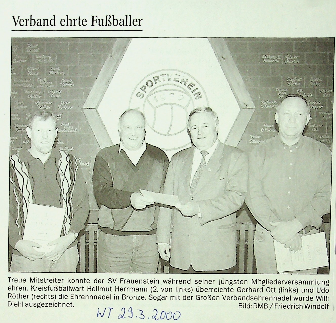 Zeitgleich war er seit Beginn der 1970er Jahre über knapp 30 Jahre als Schriftführer und Spielausschuss im Vorstand des SVF aktiv, sodass er insgesamt fast 40 Jahre ehrenamtliche Vorstandsarbeit für unseren Verein geleistet hat! Er war darüber hinaus der Mann der Daten, bevor es fussball.de und FuPa.net gab. Seit 1970 gibt es dank seiner Aufzeichnungen ausführliche Statistiken und Zeitungsberichte über unsere Vereinshistorie sowie über den gesamten Wiesbadener Amateurfußball. Aufgrund seiner außergewöhnlichen Verdienste für den SV Frauenstein 1932 e.V. wurde er im Jahr 2000 von dem damaligen Kreisfußballwart Hellmut Herrmann mit der großen Verbandsehrennadel des Hessischen Fußball Verbandes ausgezeichnet und erhielt im Jahr 2003 nach der Einweihung des Kunstrasenplatzes das Frauensteiner Siegel. Zum Ehrenmitglied des Vereins wurde er bereits 1991 von Udo Röther ernannt. Der Vorstand des Vereins ist Willi Diehl zur Dankbarkeit verpflichtet und wird ihm ein ehrendes Andenken erhalten! Wir trauern gemeinsam mit seiner Frau Ute und wünschen ihr in dieser schweren Zeit viel Kraft!