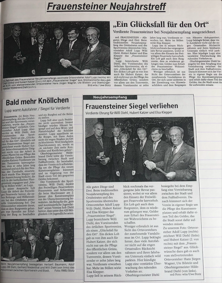 Willi Diehl kam Ende der 1960er Jahre als Spieler zum SVF und übernahm zeitgleich den Posten des Schriftführers im Vorstand des Vereins. Über 30 Jahre hatte er dieses Amt inne und engagierte sich zudem jahrelang als Spielausschussvorsitzender, bis er 1997 zum Präsidenten gewählt wurde. In seiner achtjährigen Amtszeit als 1. Vorsitzender wurde der Kunstrasenplatz im Jahr 2002 eingeweiht und der SVF konnte die legendäre Doppelmeisterschaft der Aktiven im Jahr 2004 feiern. Aufgrund seiner außergewöhnlichen ehrenamtlichen Verdienste für den SV Frauenstein wurde Willi Diehl zum Ehrenmitglied des Vereins ernannt und 2003 mit dem Frauensteiner Siegel ausgezeichnet. Durch seine handschriftlichen Aufzeichnungen von 1970 bis zum Jahr 2012 konnte zudem ein unvergleichliches Vereinsarchiv aufgebaut werden, das sämtliche Zeitungsberichte über den SVF aus über 40 Jahren enthält.