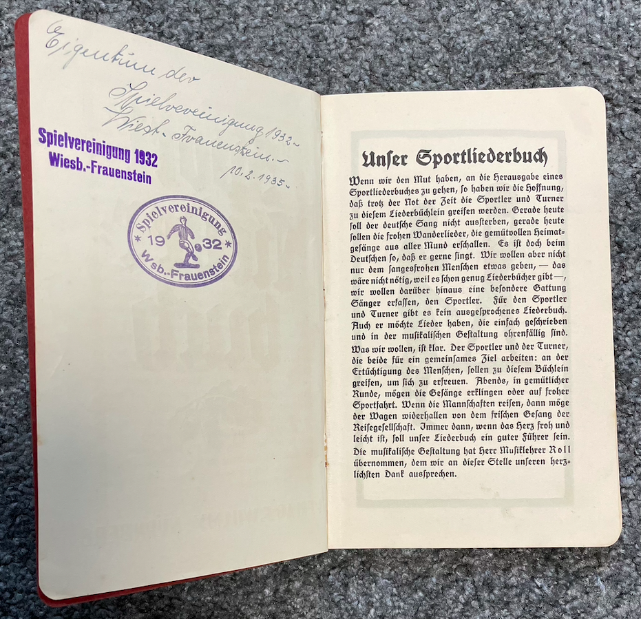 Unter den Unterlagen von Heimatforscher Harald Strauß fand sich auch ein Sportliederbuch aus dem Jahr 1935 wieder, das von unserem Verein genutzt wurde. Ob die damaligen Spieler und Verantwortlichen bereits eine Vorahnung hatten, dass der SVF knapp 65 Jahre später seine eigene Vereinshymne aufnehmen wird?