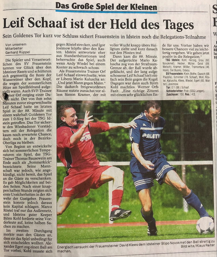 Bei der Durchsicht des SVF-Archivs ist uns ein weiterer Zeitungsbericht aus dem Jahr 2003 in die Hände gefallen. Nach dem Aufstieg in die Bezirksoberliga befand sich unsere 1. Mannschaft zum damaligen Zeitpunkt die gesamte Saison über im Abstiegskampf und lag vor dem letzten Spieltag auf einem Abstiegsplatz. Durch einen 0:1-Auswärtssieg bei der TSG Idstein gelang zum Saisonabschluss der Sprung auf den Relegationsplatz. Leider konnte unser Team diese Chance jedoch nicht nutzen und stieg nach der Relegation in die Bezirksliga Wiesbaden ab, bevor im Jahr darauf der direkte Wiederaufstieg gelingen sollte. Erinnert ihr euch an das Endspiel 2003 in Idstein, das durch einen Treffer von Leif Schaaf in der 88. Minute zu unseren Gunsten entschieden wurde?
