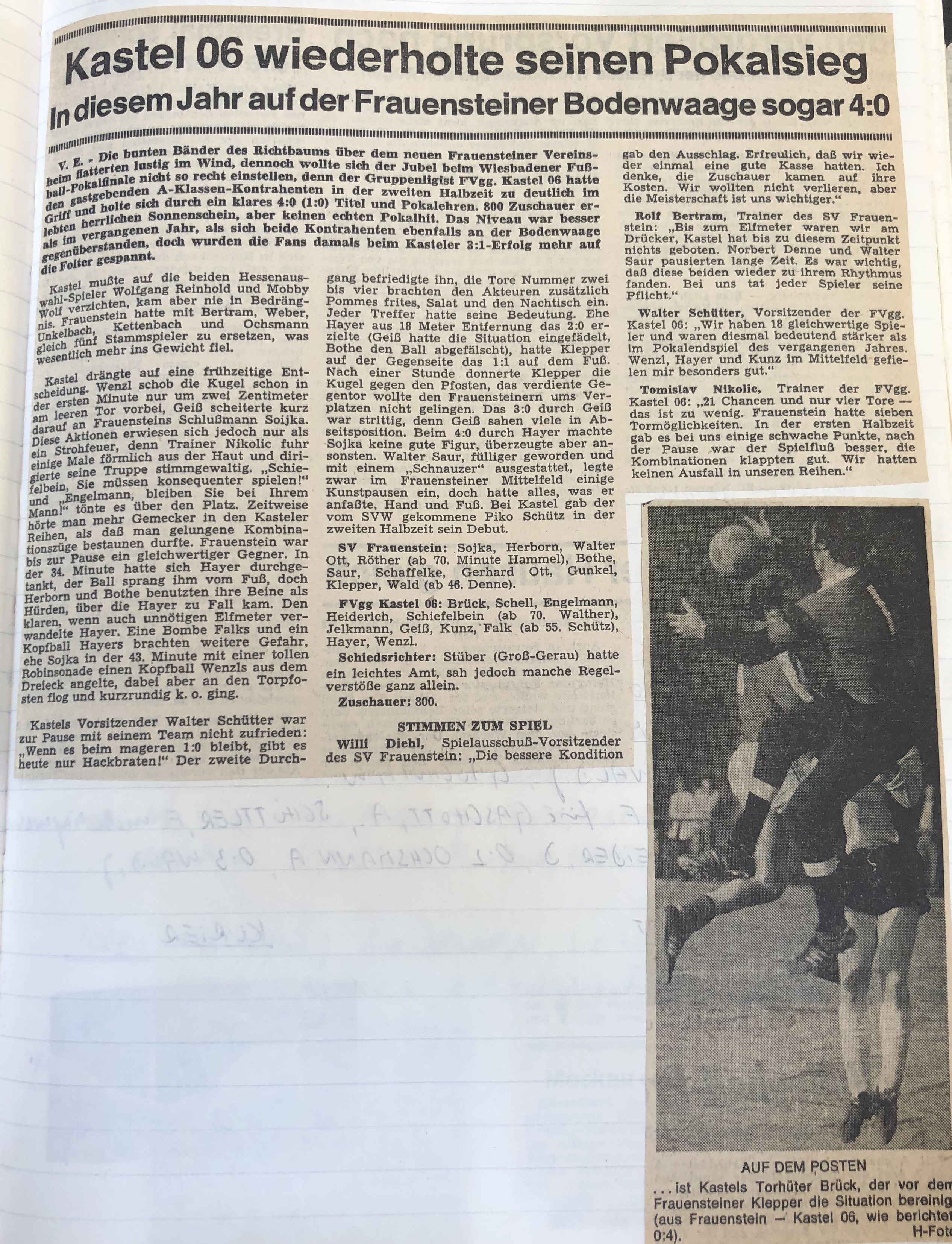 Im Jahr 1973 gelang unserer 1. Mannschaft erneut der Einzug ins Wiesbadener Kreispokalfinale. Hierbei sorgte das Team für eine faustdicke Überraschung, als es im Halbfinale den großen SV Wiesbaden 1899, der damals in der Hessenliga spielte, mit 2:1 besiegte und dadurch ins Endspiel einzog. Dort trafen wir zum zweiten Mal in Folge auf die Fvgg Kastel 06. Der Gruppenligist wurde seiner Favoritenrolle gerecht und wiederholte seinen Pokalsieg nach dem 3:1-Erfolg im Vorjahr auf der Bodenwaage durch ein deutliches 4:0. Unsere Mannschaft ließ sich durch den erneuten Rückschlag nicht entmutigen und wiederholte ihre Finalteilnahme ein Jahr später - Fortsetzung folgt kommende Woche in der nächsten Ausgabe von "Nostalgie pur!".