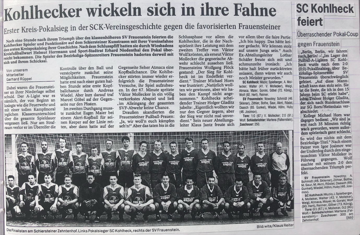 Im Saisonfinale der Spielzeit 2001/2002 stand unsere 1. Mannschaft wieder einmal im Kreispokalendspiel. Diesmal ging unser Team allerdings erstmals als Favorit gegen den 1. SC Kohlheck ins Finale, in dem wir jedoch überraschend besiegt wurden. 2:0 hieß es am Ende für den A-Ligisten aus Kohlheck, der sich gegen unsere Bezirksliga-Truppe durchsetzen konnte. Trainer Michael Horn war nach der Niederlage sichtlich bedient und äußerte erste Zweifel an der angestrebten Meisterschaft. Trotz dieses unglücklichen Rückschlags ließ sich unser Team im weiteren Saisonverlauf nicht aus dem Konzept bringen und das verlorene Pokalfinale geriet durch den Aufstieg in die Bezirksoberliga am Saisonende schnell in Vergessenheit.