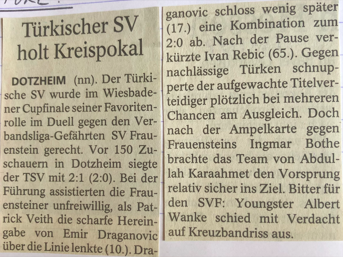 Die Serie unserer Finalteilnahmen endet heute mit dem insgesamt 8. und bis heute letzten Kreispokalendspiel unserer 1. Mannschaft aus dem Jahr 2010. Nach dem Kreispokalsieg 2009 fiel unser Team in altbekannte Muster zurück und musste sich zum siebten Mal mit dem zweiten Platz zufrieden geben. Die 2:1-Finalniederlage gegen den Türkischen SV Wiesbaden war eine von vielen bitteren Pleiten der Saison 2009/2010, an deren Ende der Abstieg aus der Verbandsliga Hessen Mitte stand.