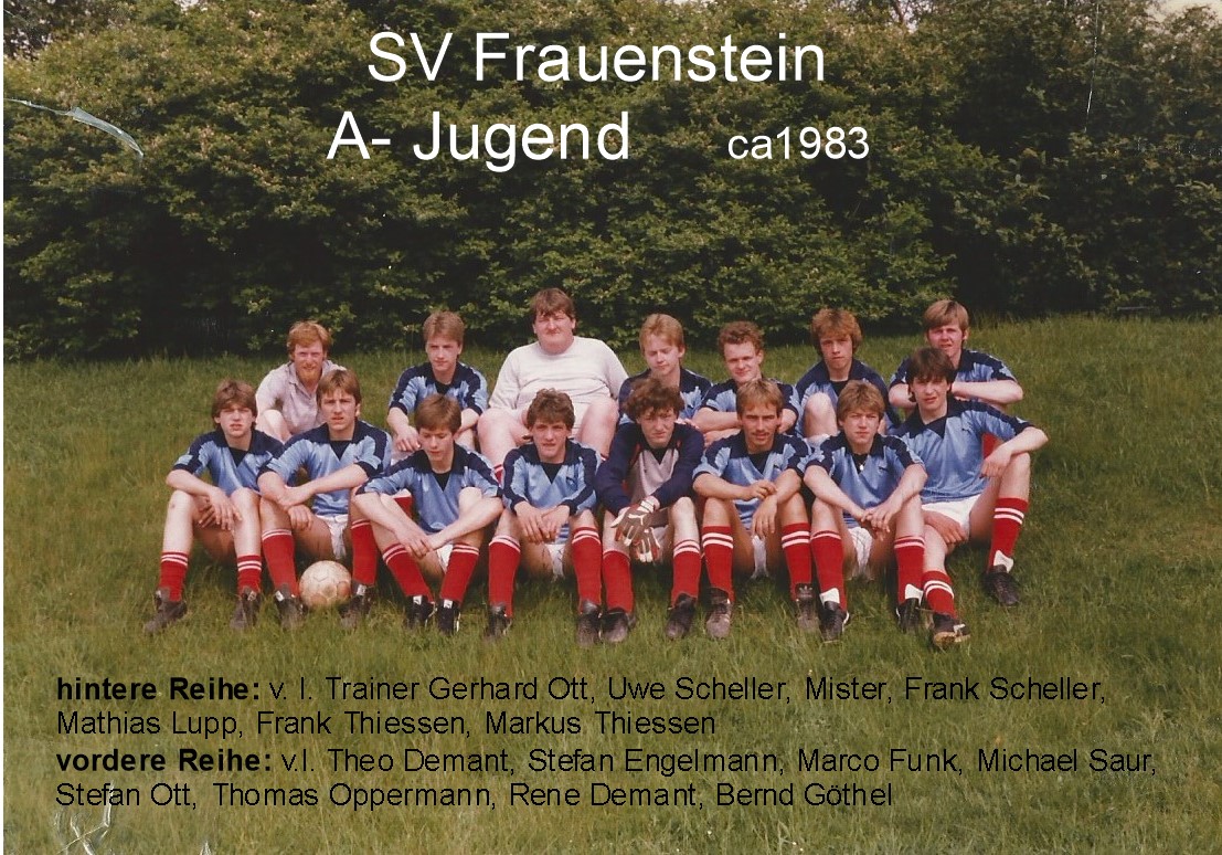 Heute schauen wir zurück auf unsere A-Jugend aus dem Jahr 1983, die damals überraschenderweise in blauen Trikots auflief. Erkennt ihr einige Frauensteiner Gesichter, die teilweise bis heute bei unseren Alten Herren aktiv sind?