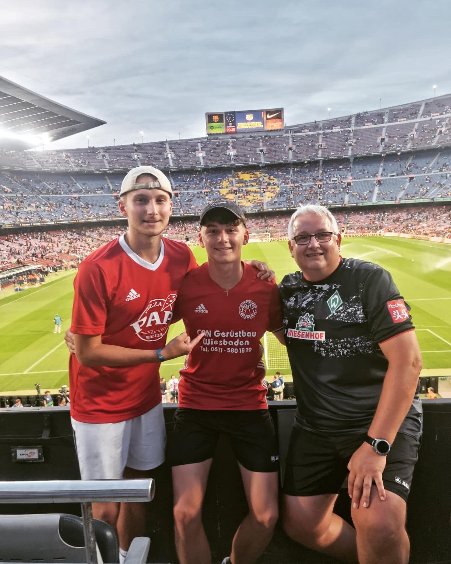 Unsere „Jungen Wilden“ (Lukas Waschke, Dennis Waschke, Leon Lavizar und Robin Nebel) verbringen ihren Sommerurlaub gemeinsam mit ihrem Spielerberater Matthias Waschke in Spanien und waren gestern zu Gast beim Freundschaftsspiel des FC Barcelona gegen Manchester City (Endstand: 3:3). Trotz intensiver Bemühungen konnten die Verantwortlichen im Camp Nou nicht von einem Tauschgeschäft 4 SVF-Talente gegen Frenkie de Jong überzeugt werden, um die bestehenden Spannungen zwischen dem niederländischen Nationalspieler und seinem Club zu beseitigen - böse Zungen behaupten der Deal scheiterte an dem seltsamen schwarz-grünen Trikot des Spielervermittlers, der im Gegensatz zu seinen Schützlingen nicht in den Vereinsfarben rot-weiß unterwegs war. Dennoch hatten unsere Jungs einen schönen Abend und konnten ein interessantes Spiel mit insgesamt 6 Treffern im größten Fußballstadion Europas verfolgen. Wir wünschen euch weiterhin viel Spaß in Spanien, Männer - genießt die Zeit und kommt gut erholt für die laufende Spielzeit zurück auf die Bodenwaage!