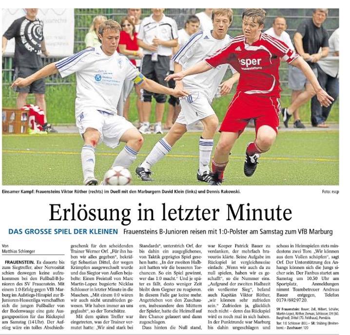 Die Saison 2009/2010 schloss das Team auf dem dritten Platz der Gruppenliga Wiesbaden ab. Da der Tabellenerste JFV Dietkirchen/Offheim auf die Teilnahme an den Aufstiegsspielen zur B-Junioren-Hessenliga verzichtete und der Tabellenzweite SV Wehen II nicht aufsteigen durfte, nahmen unsere B-Junioren an der Relegation zur Hessenliga teil. Der Gegner in der Relegation hieß VFB Marburg. Die Rollen schienen aufgrund der Statistik der Marburger, welche ihre Liga ungeschlagen mit 23 Siegen, einem Unentschieden und einem Torverhältnis von 112:10 gewinnen konnten, vor den Relegationsspielen klar verteilt...