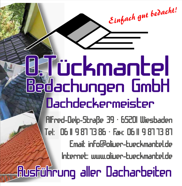 Herzlich Wilkommen beim Dachdeckermeisterbetrieb Oliver Tückmantel | Bedachungen GmbH, Ihr Fachbetrieb für den gesamten Bereich der Dach-, Fassaden- und Abdichtungstechnik. Mit Sitz in Wiesbaden-Frauenstein sind wir im Großraum Wiesbaden, Mainz, Frankfurt tätig. Durch kontinuierliche Schulungen unserer Mitarbeiter z. B. im Bereich Wärmedämmung, Flachdachabdichtung oder Dachfenstertechnik gewährleisten wir eine fachkompetente, termingerechte und verantwortungsvolle Betreuung unserer Kunden auf höchstem Niveau. Kundenzufriedenheit und langfristige Kundenbeziehungen stehen im Mittelpunkt unseres Handelns. Informieren Sie sich auf unserer Homepage über unser Leistungsspektrum. Wir freuen uns auf Ihre Anfrage, kein Auftrag ist uns zu klein.